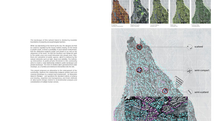 This project proposes an alternative to the enlargement of the community, explores the relationship between private land and common landscape in a natural rural environment - on Nessoden island in Norway - and questions the standard notions of privacy and sharing, segregation and transparency, and fresh methods of data-based design related to environmental analysis and consideration of multiple human senses.